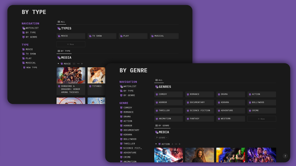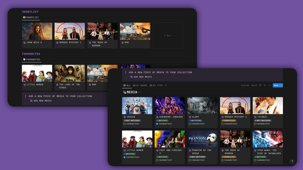 This simple template lets you keep track of all your favourite movies, tv shows, plays, musicals etc. all in one place.